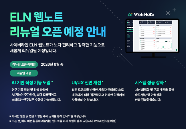 사이버라인 클라우드 전자연구노트 ‘ELN 웹노트’가 새롭게 리뉴얼됩니다.