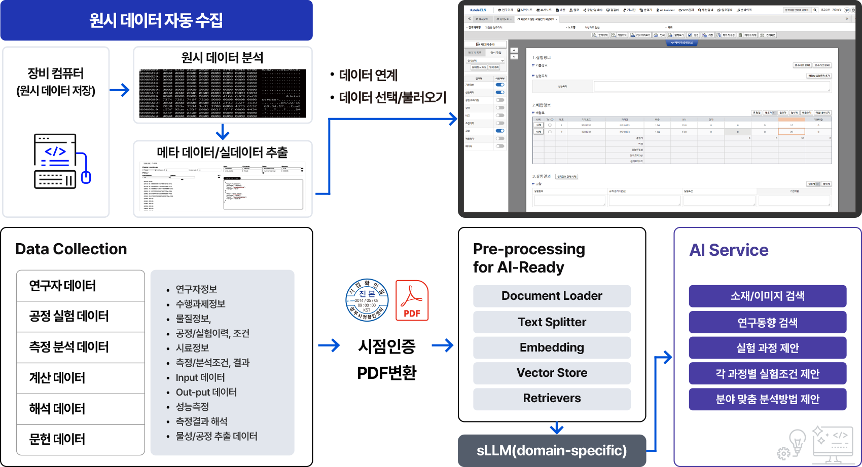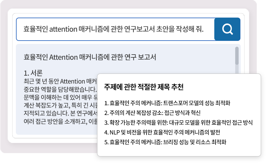 | 초안 작성 | A.I 연구노트: AI가 주제에 적합한 연구노트 내용을 전개하고, 기관내 자료/공개 자료를 참고하여 필요한 내용을 발췌 | 일반연구노트 : 사용자가 얼개를 작성하고, 다양한 소스를 탐색하여 필요한 자료를 발췌 |