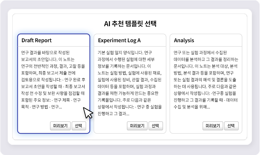 인공지능 기반의 템플릿 추천 및 초안 작성 기능을 통해 연구노트 작성 효율을 극대화하고,