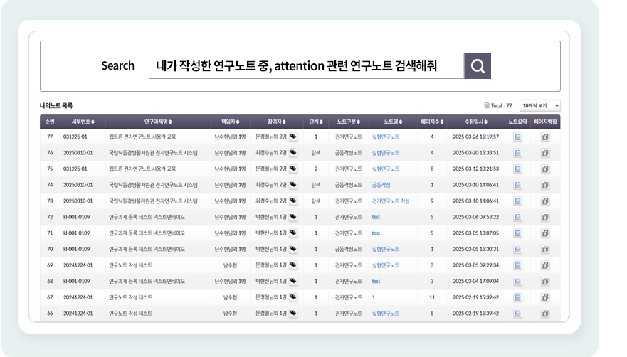 작성된 연구노트를 벡터 데이터로 인덱싱하여 후속 연구에 손쉽게 활용할 수 있도록 관리합니다.